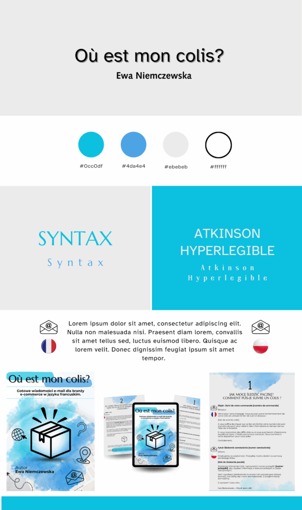 Klientka dostarczyła przykładowe strony eBooka oraz wskazała wybraną kolorystykę okładki, na podstawie czego wykonałam poniższe zadania: